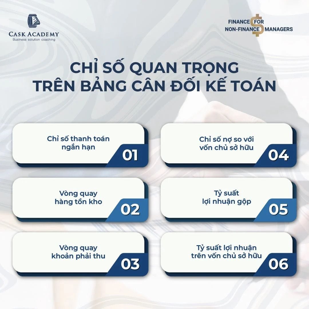 Bảng cân đối kế toán gồm nhiều khoản mục, được gọi là tài khoản. Để nắm tình hình tài chính, bạn không cần phải nắm rõ từng con số ở mỗi tài khoản, mà cần biết những chỉ số quan trọng – được tính toán dựa trên các số liệu tài khoản ấy. Các chỉ số cần nhất cho chủ doanh nghiệp bao gồm: