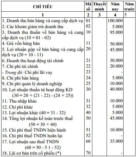 Các khoản mục trong báo cáo được thể hiện trong bảng dưới đây: