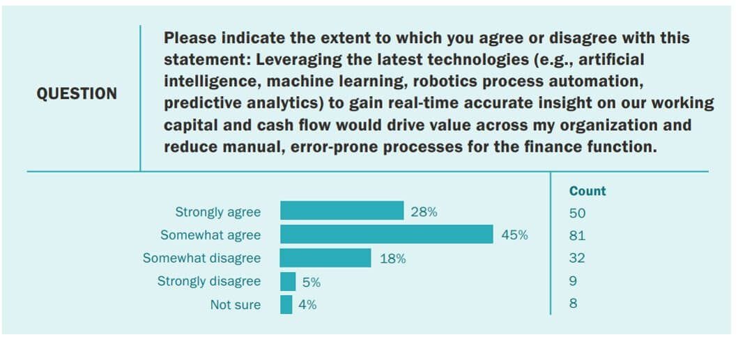 Đáng chú ý, trong vòng 12 tháng tới, những công việc liên quan đến kế toán công nợ (account receivable) và kế toán thanh toán (account payable) sẽ được số hóa hoặc tự động hóa. Các đáp viên là CFO đều nhận định rằng các công nghệ mới nhất có ưu điểm cung cấp dữ liệu thời gian thực chính xác về vốn lưu động, dòng tiền hơn là quy trình thủ công vốn thường xuyên phát sinh lỗi. Không chỉ vậy, công nghệ còn giúp cải thiện năng suất của nhân viên, bù đắp lại sự thiếu hụt nhân viên, giúp nhân sự dành thời gian nhiều hơn vào các nhiệm vụ mang tính chiến lược.
