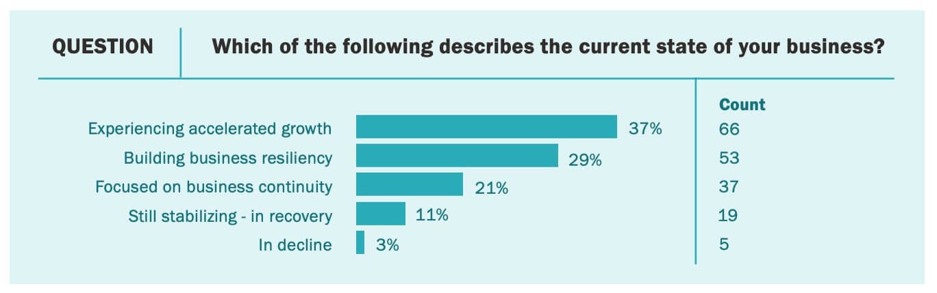 Mặc dù tỷ lệ lạm phát năm 2022 đã chạm mức kỷ lục, nền kinh tế nhiều khả năng rơi vào suy thoái, thị trường lao động gặp nhiều khó khăn, các quản lý tài chính cấp cao có đánh giá tương đối tích cực về tình hình doanh nghiệp. Có đến 37% cho biết doanh nghiệp của họ đang ở mức độ tăng trưởng nhanh chóng, 29% phản hồi rằng tổ chức của họ đang dần phục hồi. Đáng chú ý, chỉ có 3% đáp viên cho biết hoạt động kinh doanh của doanh nghiệp đang giảm sút.