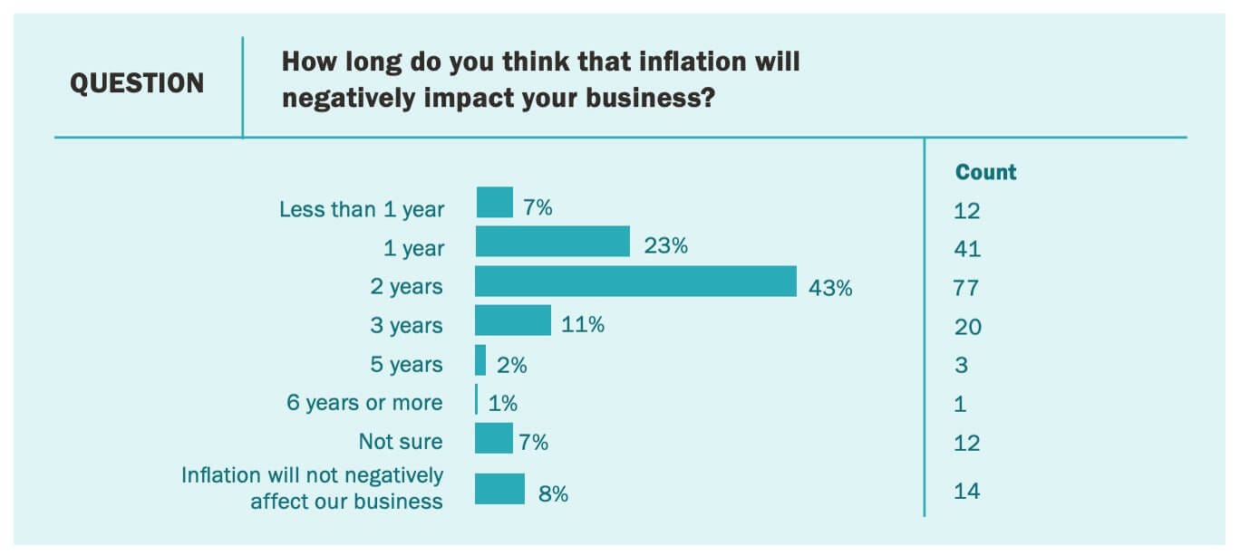 Dẫu vậy, lạm phát vẫn là nguy cơ lớn nhất ngăn cản sự phát triển của doanh nghiệp trong thời gian tới. 43% dự đoán lạm phát sẽ tác động tiêu cực đến các doanh nghiệp trong vòng hai năm tới. Trong khi đó, 14% cho rằng lạm phát sẽ có ảnh hưởng dài hạn hơn thế. Chỉ có 8% khẳng định công ty của họ sẽ không bị tác động xấu bởi tình hình lạm phát. Tuy nhiên, 72% đáp viên đều có chung nhận định rằng lạm phát sẽ có ảnh hưởng tiêu cực đối với khả năng tăng trưởng của doanh nghiệp. Ở phần này, một đáp viên ẩn danh cho biết, bất chấp tác động từ COVID-19, doanh thu của họ đã tăng trưởng mạnh mẽ vào năm 2021. Tuy nhiên, khi bước qua năm 2022, tốc độ tăng trưởng của họ bị chững lại do lạm phát. Theo đáp viên này, tốc độ tăng trưởng không kéo dài liên tục mà có thay đổi lên xuống thất thường.