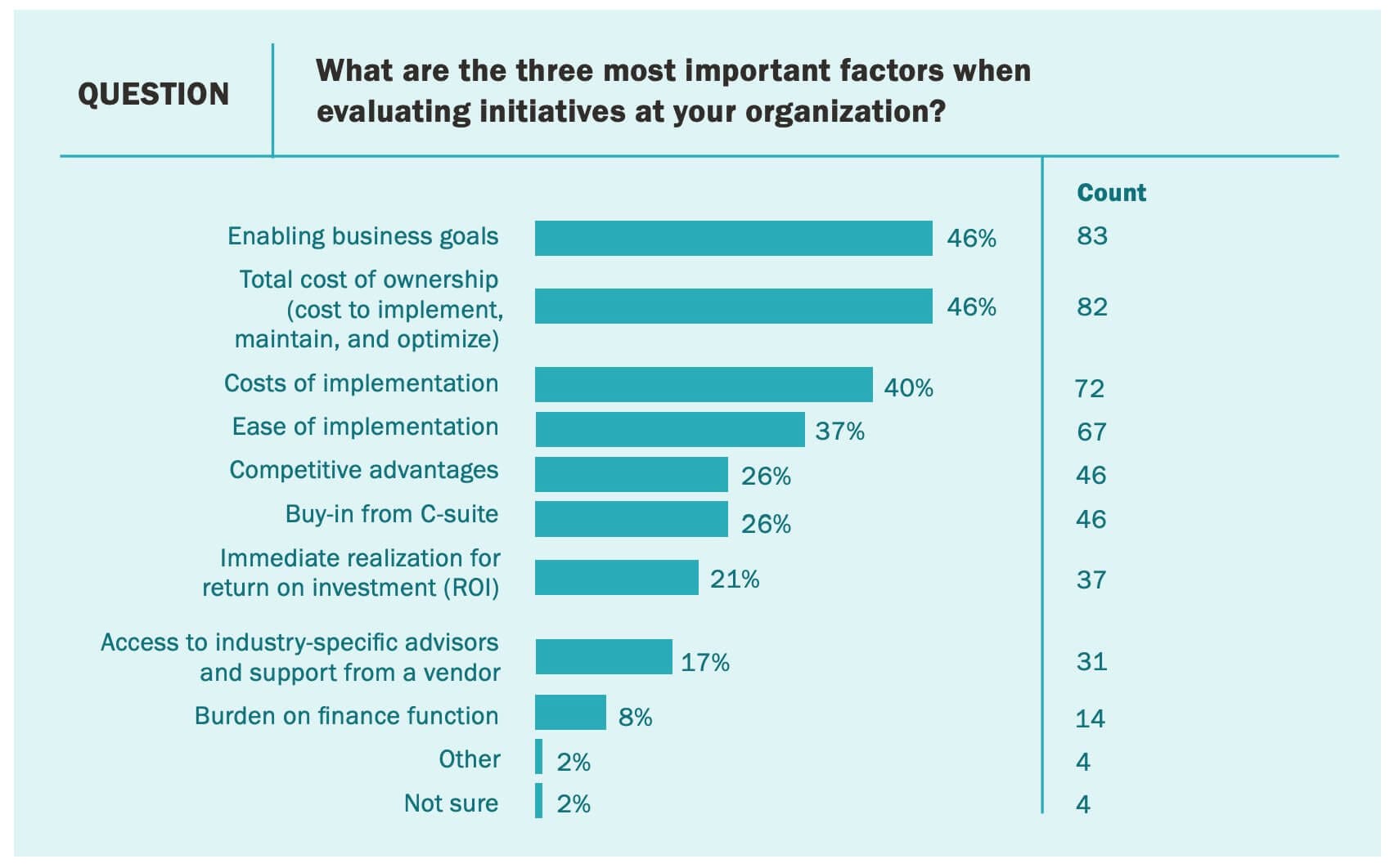 Trong khi lợi ích của quá trình chuyển đổi số đã quá rõ ràng, trở ngại lớn nhất chủ yếu nằm ở chi phí. Kết quả khảo sát cho thấy, 3 tiêu chí hàng đầu được các quản lý tài chính cấp cao lựa chọn bao gồm: khả năng đạt được mục tiêu chiến lược của doanh nghiệp, tổng chi phí đầu tư cho hoạt động cải tiến (gồm chi phí đầu tư ban đầu, duy trì và tối ưu hệ thống) và các chi phí vận hành có liên quan. Thông qua đó, có thể thấy quá trình chuyển đổi số là một gánh nặng khá lớn về mặt tài chính.