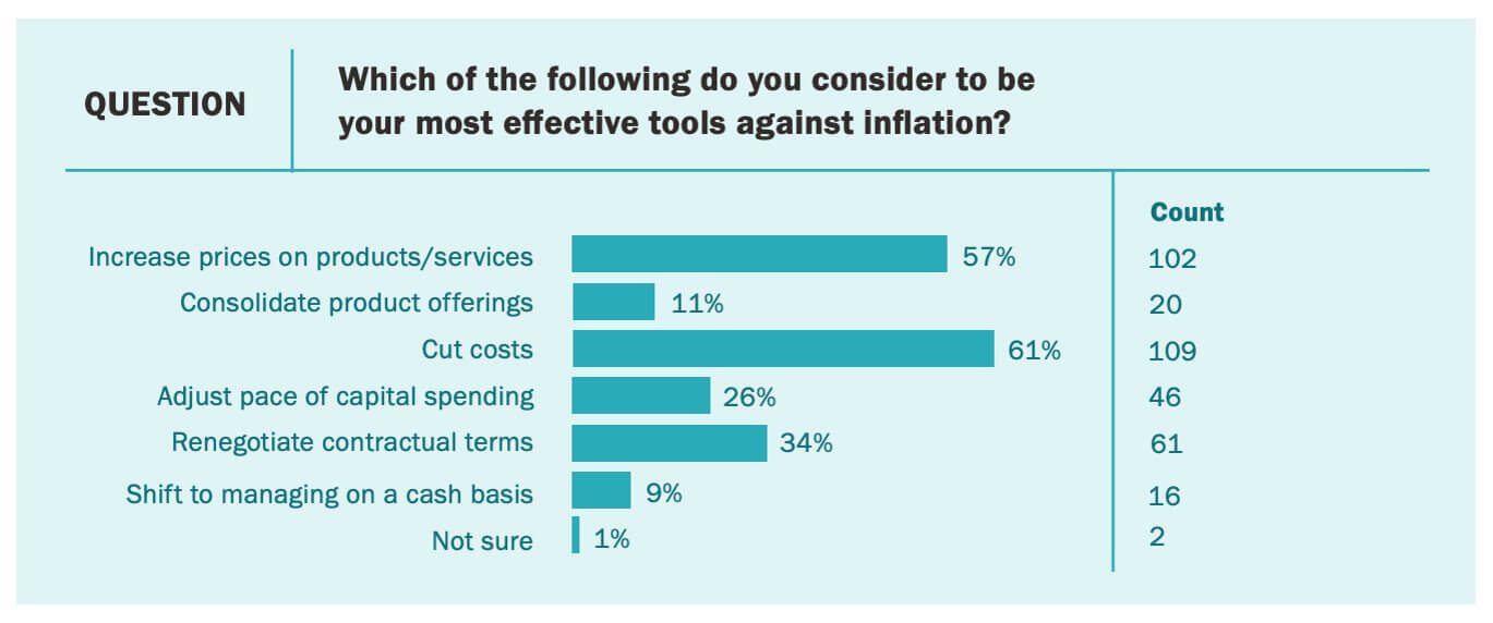 Vậy nên, để đối phó với lạm phát, hai giải pháp phổ biến nhất được đáp viên lựa chọn là cắt giảm chi phí (61%) và tăng giá bán sản phẩm - dịch vụ (57%). Có thể thấy các doanh nghiệp tăng giá thành sản phẩm và tăng tỷ suất lợi nhuận để hỗ trợ đạt được mục tiêu tăng trưởng. Thế nhưng, phương pháp này có thể gây tác dụng ngược cho khách hàng, đặc biệt là nhóm sản phẩm - dịch vụ có độ nhạy cảm về giá cao. Một quản lý tài chính cấp cao chia sẻ, thách thức lớn nhất đó là làm thế nào để tăng giá đối với các hợp đồng dài hạn và hợp đồng đã ký trước đó. Vào thời điểm ký hợp đồng thì mức giá thấp hơn, song đến thời điểm thực hiện hợp đồng hiện tại thì chi phí lại tăng. Lúc này, họ buộc phải cân nhắc hủy hợp đồng cũ để tăng giá và có khả năng cao sẽ đánh mất khách hàng. Một giải pháp khác đó là thương thảo lại giá cả nhằm bù lại phần chi phí hoạt động đang ngày càng tăng.