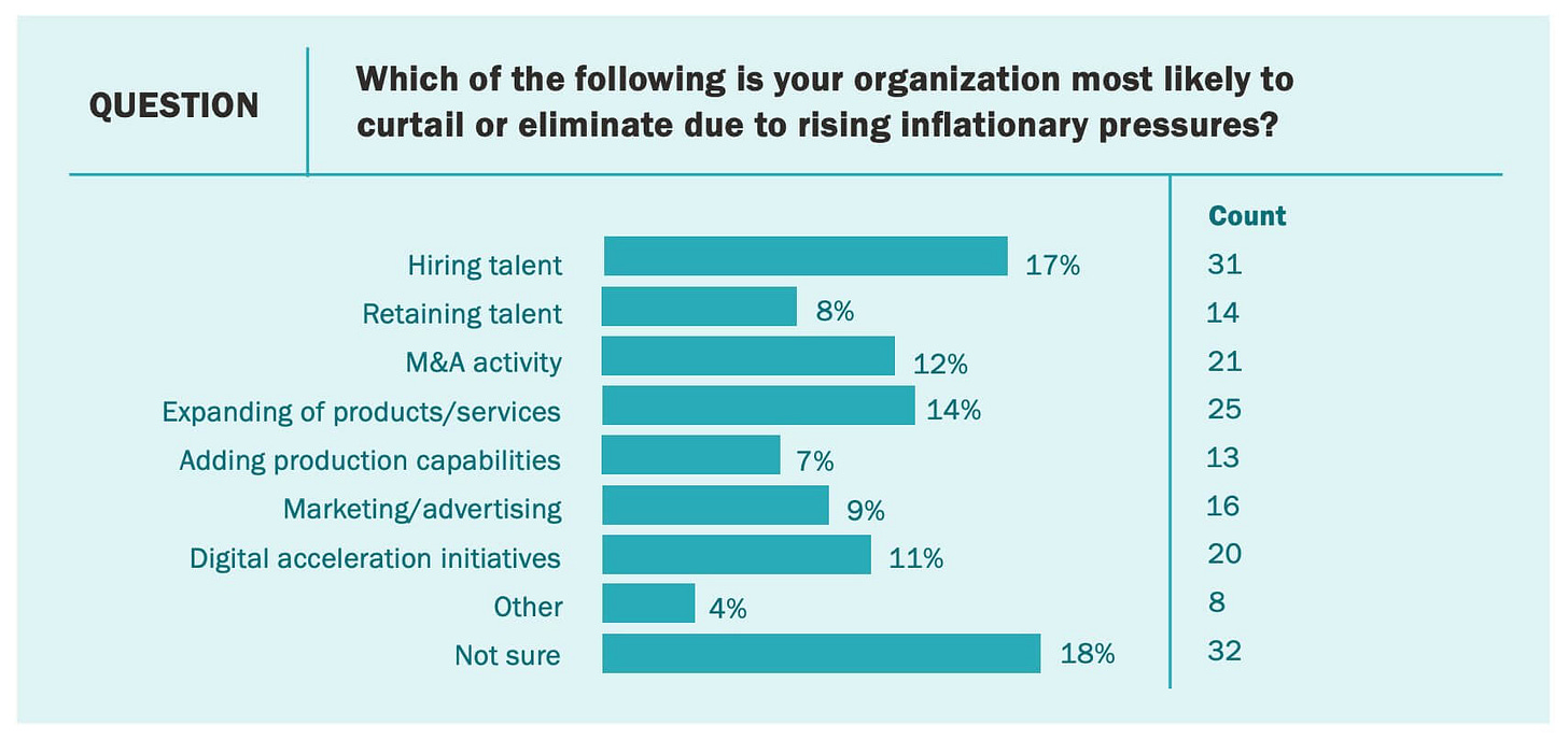 Đáng chú ý, theo kết quả khảo sát, hầu như không có giải pháp chung để cắt giảm hoặc loại bỏ áp lực tài chính do lạm phát gia tăng. Ở câu hỏi này, đáp viên chỉ được chọn một đáp án duy nhất. Lựa chọn chiếm đa số là họ sẽ cắt giảm hoạt động tuyển dụng nhân sự với 17%, kế đến là tạm hoãn kế hoạch mở rộng dòng sản phẩm - dịch vụ chính của doanh nghiệp. Điều bất ngờ là có đến 18% phản hồi rằng họ không chắc chắn đâu là giải pháp tốt nhất để giảm bớt hoặc loại bỏ áp lực do lạm phát.