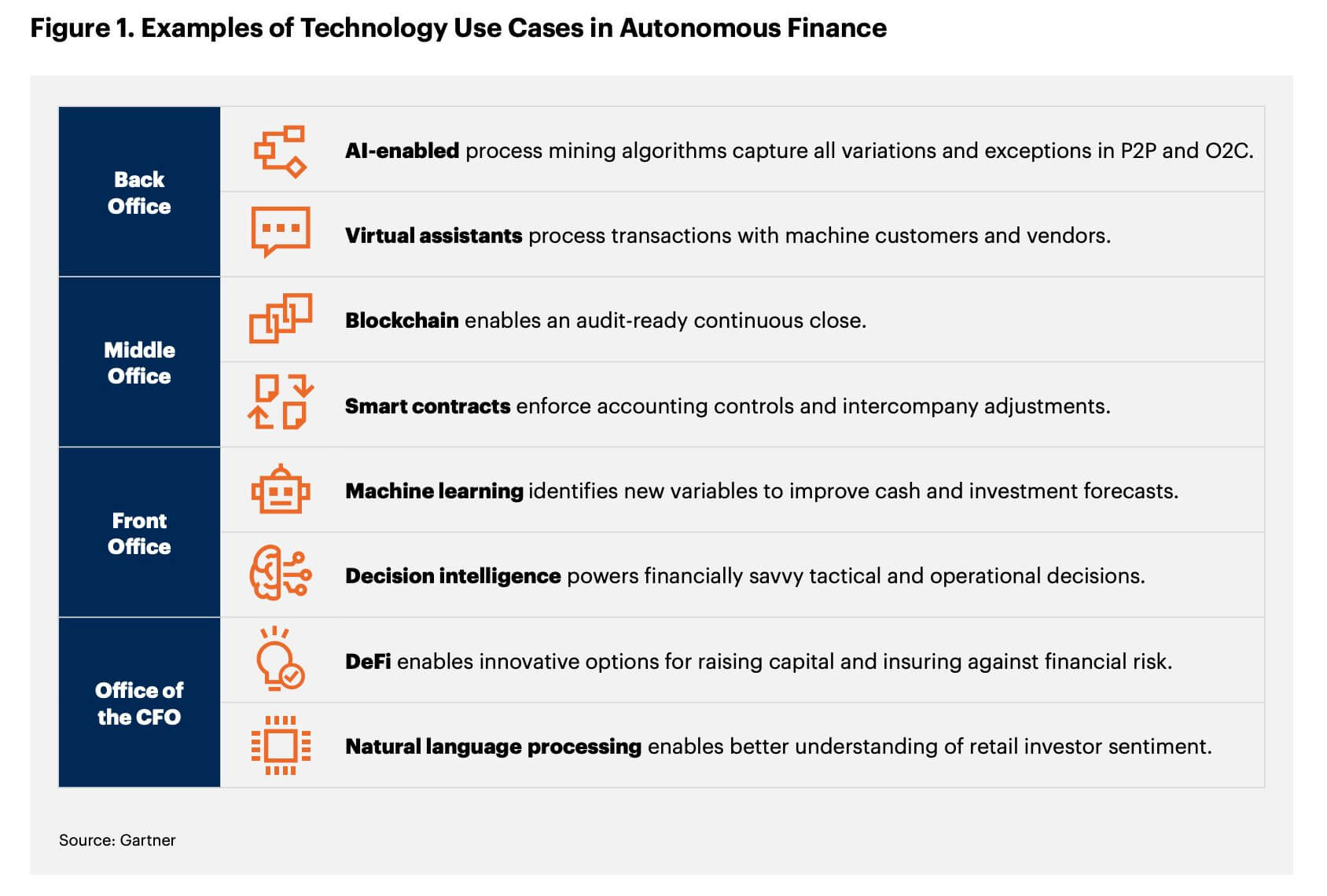 Trên thực tế, với sự xuất hiện của các công nghệ tiên tiến như công nghệ tự học (self-learning) và tự động chỉnh sửa (self-correction), mô hình tài chính tự chủ đang có tốc độ lan tỏa rất mạnh mẽ. Theo kết quả khảo sát được Gartner thực hiện vào năm 2021 với hơn 400 tổ chức trên toàn cầu, 64% CFO khẳng định rằng mô hình này sẽ được hiện thực hóa chỉ trong vòng 6 năm tới. Thế nhưng, có rất ít doanh nghiệp ứng dụng các công nghệ hiện đại vào hoạt động vận hành. Cụ thể hơn, 21% cho biết công ty của họ đang sử dụng máy học, 19% dùng phân tích đề xuất (prescriptive analytics), 12% ứng dụng công nghệ xử lý ngôn ngữ tự nhiên và chỉ có 8% dùng chuỗi khối.