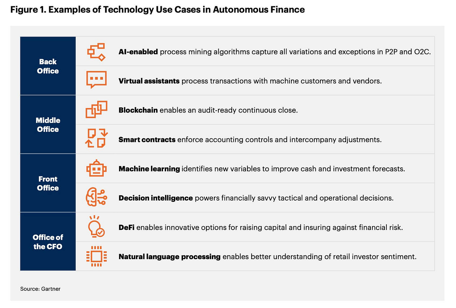 Mô hình autonomous finance là khi một lượng công việc nhất định sẽ được vận hành, quản lý bởi các phần mềm tự học (self-learning software). Mô hình này sẽ giúp tối ưu các hoạt động vận hành thuộc back office (bộ phận hành chính), middle office (quản trị rủi ro), front office (bộ phận marketing, bán hàng và chăm sóc khách hàng) và các hoạt động khác liên quan đến nhiệm vụ của CFO.