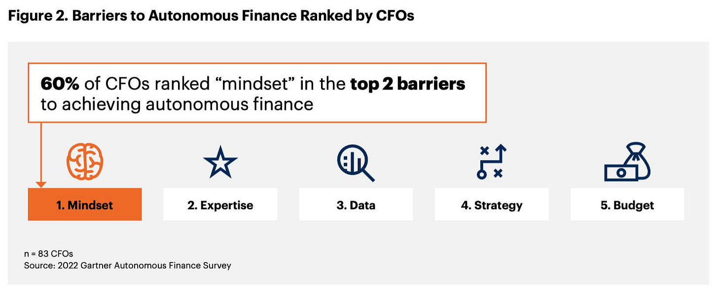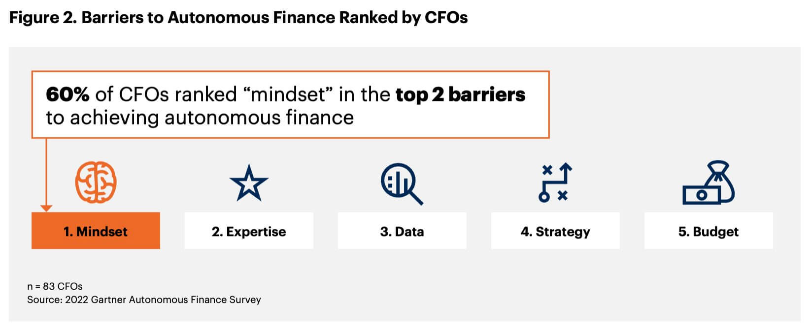 Mặc dù có nhiều lợi ích khi chuyển đổi từ tự động hóa sang mô hình tự chủ (autonomous) trong bộ phận tài chính, rất ít công ty có kế hoạch hoặc lộ trình rõ ràng nhằm tận dụng cơ hội này. Dẫu vậy, có nhiều nguyên nhân khiến các doanh nghiệp gặp nhiều trở ngại trong quá trình chuyển đổi này.