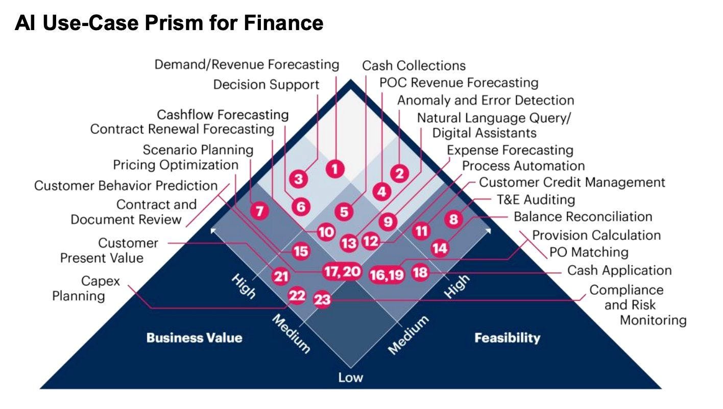 Theo gợi ý từ Gartner, CFO và các quản lý cấp cao của phòng ban FP&A có thể tham khảo 23 trường hợp phổ biến nhất khi ứng dụng AI vào tác vụ tài chính (xem chi tiết ở hình ảnh bên dưới). Điều tiếp theo cần làm đó là đánh giá và quyết định đâu là lĩnh vực công tác tài chính hiện tại có thể ứng dụng AI để đạt được mục tiêu tăng trưởng, cũng như đáp ứng được những nhu cầu của doanh nghiệp.