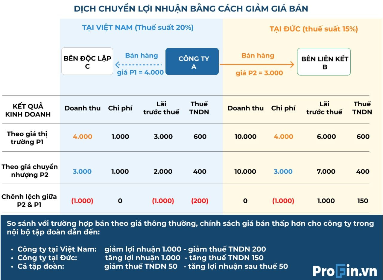 Ví dụ 1: giảm thu nhập ở nơi có thuế suất cao và giảm chi phí ở nơi có thuế suất thấp bằng cách giảm giá bán trong nội bộ tập đoàn.