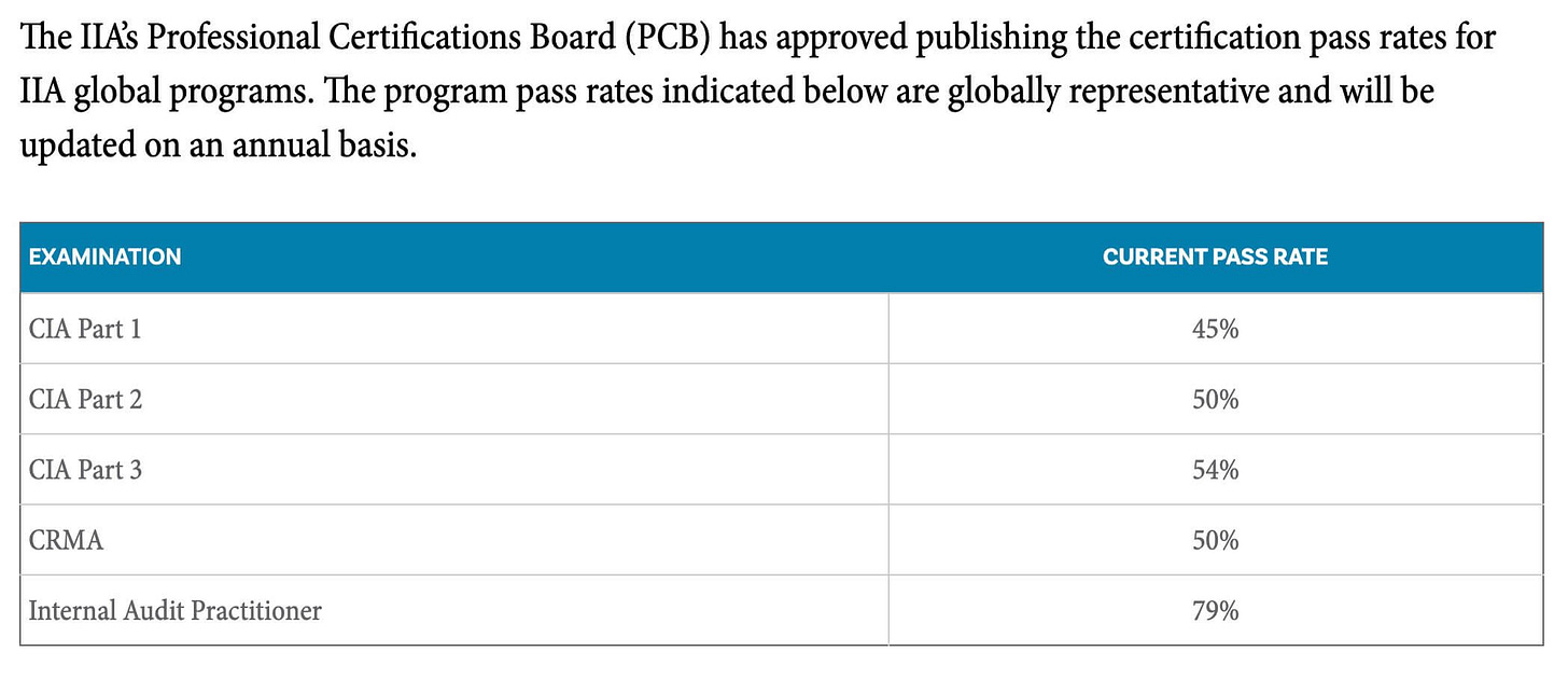 Theo công bố chính thức từ IIA, tỷ lệ thi đậu toàn cầu của 3 phần dao động trong khoảng 40%-50% (xem chi tiết ở ảnh bên dưới).
