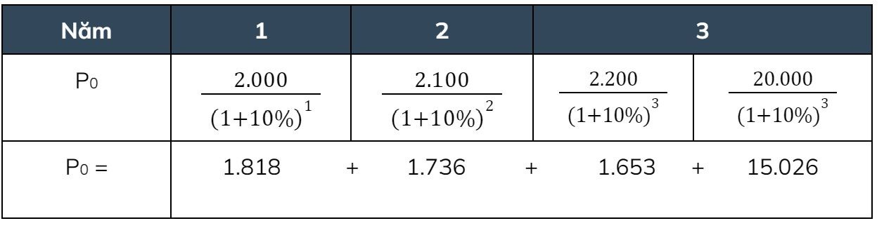 Ví dụ: Trong 3 năm tới, cổ phiếu ABC được kỳ vọng sẽ chi trả cổ tức lần lượt là 2.000 đồng, 2.100 đồng và 2.200 đồng. Giá cổ phiếu được kỳ vọng là 20.000 đồng tại thời điểm cuối năm thứ 3. Biết lợi suất yêu cầu (ke) của cổ phiếu này là 10%. Tính giá trị P0 của cổ phiếu.
