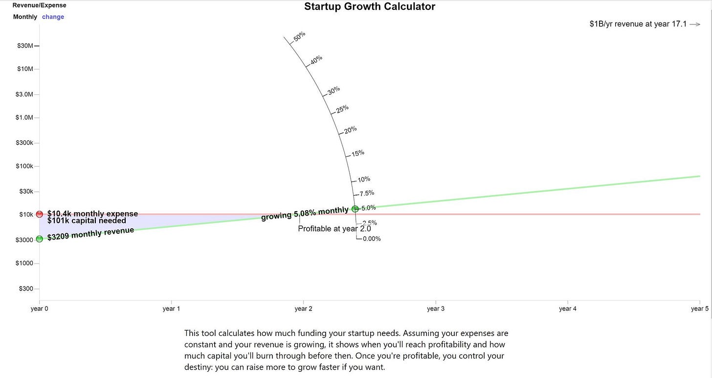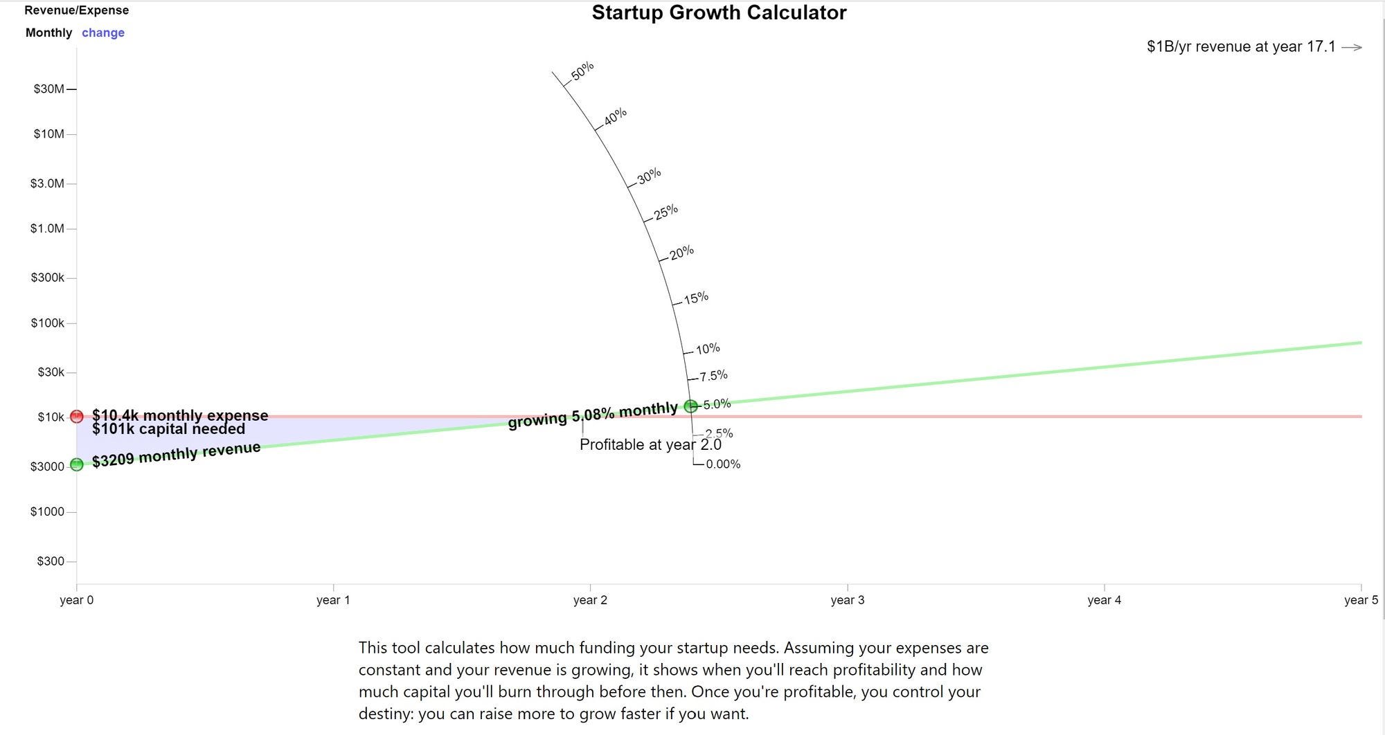 Có thể lấy ví dụ minh họa như hình bên dưới, một startup với chi phí cố định là 10.400$ / tháng, doanh thu hiện tại là 3.209$ và tăng trưởng ổn định với tốc độ 5,08% tháng. Máy tính cho kết quả startup này sẽ đạt lợi nhuận sau 2 năm, và số tiền tối thiểu cần để duy trì hoạt động cho đến thời điểm đó là 101.000$.