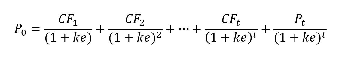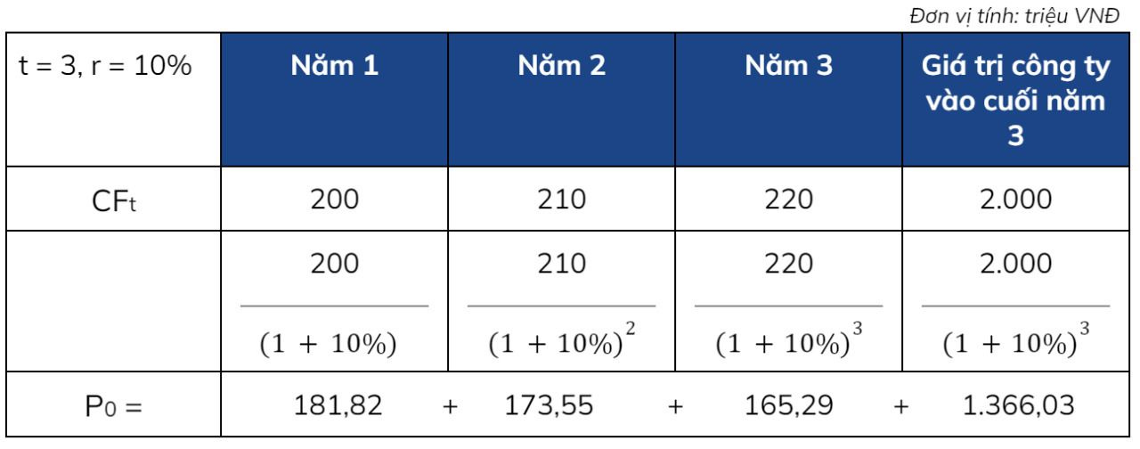Ví dụ: Trong 3 năm tới, dòng tiền tự do thuộc về chủ sở hữu (FCFE) mỗi năm của một công ty được dự phóng lần lượt là 200 triệu, 210 triệu và 220 triệu đồng. Giá trị của công ty được kỳ vọng là 2 tỷ đồng tại thời điểm cuối năm thứ 3. Tỷ suất sinh lời kỳ vọng (ke) khi đầu tư vào công ty là 10%. Như vậy giá trị nội tại (P0) của công ty được tính như sau: