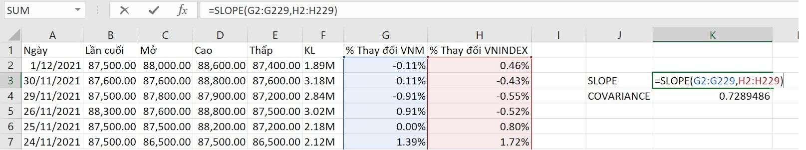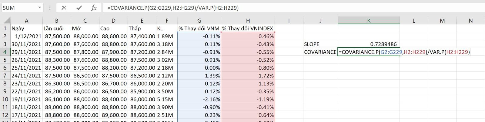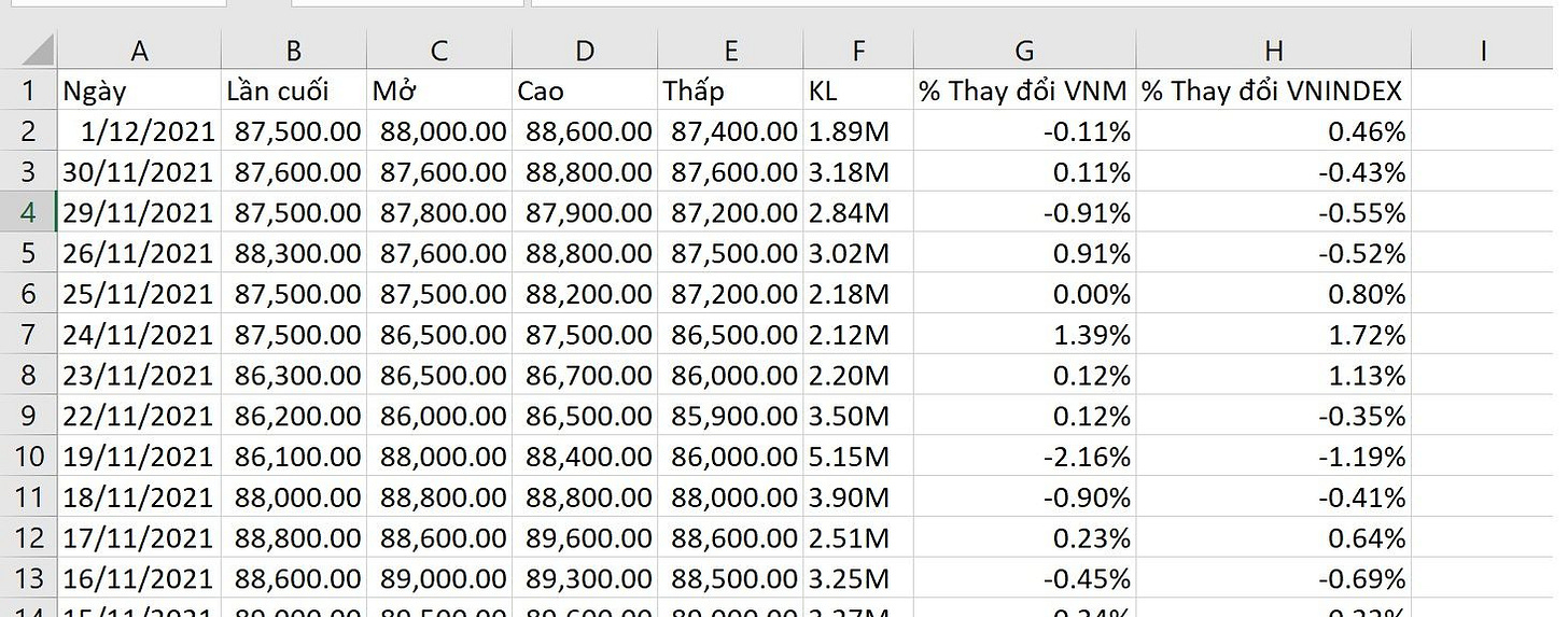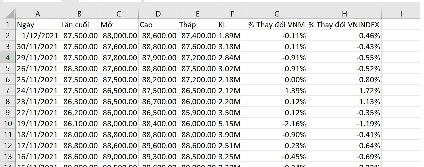 Ví dụ: tính hệ số Beta của cổ phiếu VNM so với chỉ số VNINDEX từ ngày 1/1/2021 đến ngày 1/12/2021.