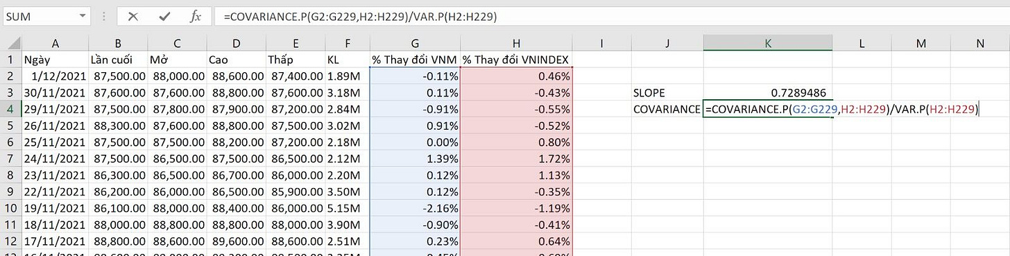 Bước 3: Áp dụng công thức hoặc hàm Slope để tính ra chỉ số Beta.