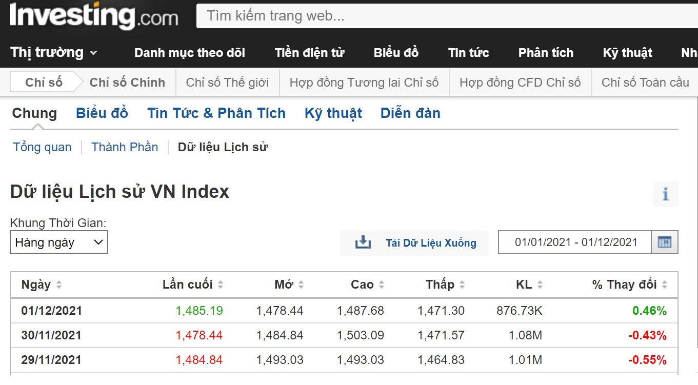 Bước 1: Đầu tiên, cần tải dữ liệu về giá của cổ phiếu VNM và chỉ số VNINDEX trên Investing.com. Lưu ý: chọn thời gian biến động tương ứng là 1/1/2021 đến 1/12/2021.