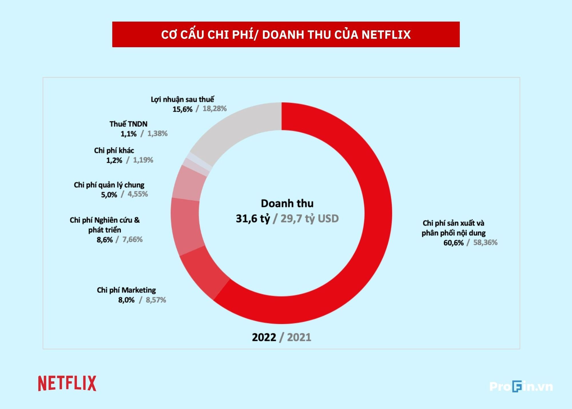 Chi phí cho hoạt động sản xuất và phân phối nội dung chiếm tỷ trọng lớn, khoảng 61% doanh thu của Netflix theo số liệu thu thập từ báo cáo kết quả kinh doanh 2022, bao gồm: