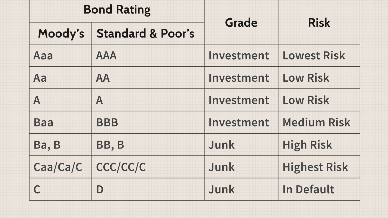 Trái phiếu được xếp hạng cao hơn được gọi là loại đầu tư (investment grade) và được các nhà đầu tư săn lùng nhiều nhất. Ngược lại, trái phiếu có xếp hạng tín dụng thấp được gọi là trái phiếu không đầu tư hoặc trái phiếu rác (non-Investment grade/Junk bond).