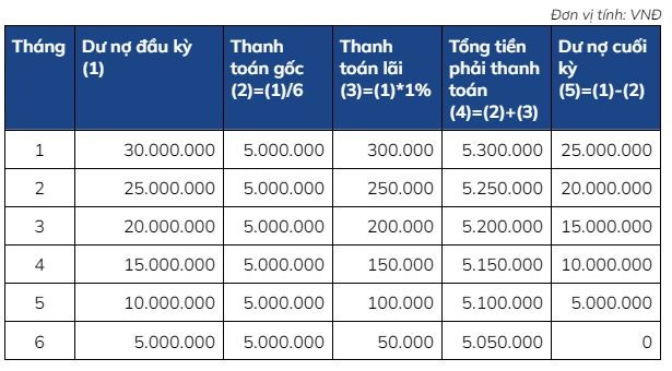 Ví dụ: Khách hàng vay tín chấp ngân hàng X số tiền 30 triệu trong 6 tháng với lãi suất cố định 12%/năm (1%/tháng) và lãi tính trên dư nợ giảm dần. Số tiền lãi và gốc hằng tháng mà khách hàng phải trả được tính như sau: