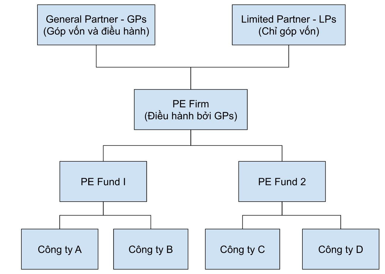 Một Công ty đầu tư PE sẽ quản lý một nhóm Quỹ đầu tư PE. Mỗi Quỹ đầu tư PE chịu trách nhiệm đem tiền huy động được để mua cổ phần của các công ty trong danh mục đầu tư.