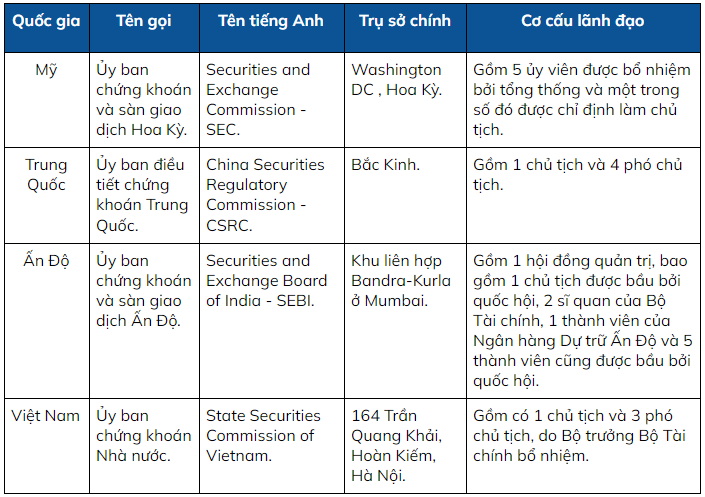 Tại Việt Nam, Ủy ban chứng khoán Nhà nước là cơ quan trực thuộc Bộ Tài chính, thực hiện chức năng tham mưu, giúp Bộ trưởng Bộ Tài chính thực hiện quản lý nhà nước về chứng khoán.